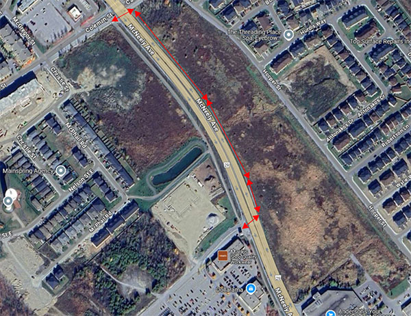 The asphalt multi-use pathway along the western shoulder of McNeely Avenue, between Coleman Street and the entrance into the Walmart plaza, will be closed until July 22nd. This pathway must be realigned as part of the future Winners construction. “Sidewalk closed” signage as well as “Use Other Sidewalk” signs will be in place at both ends of the pathway to direct pedestrian traffic to the gravel pathway on the eastern side of McNeely Avenue. Both traffic light intersections have pedestrian crossing signalization to allow safe travel to the detour pathway.